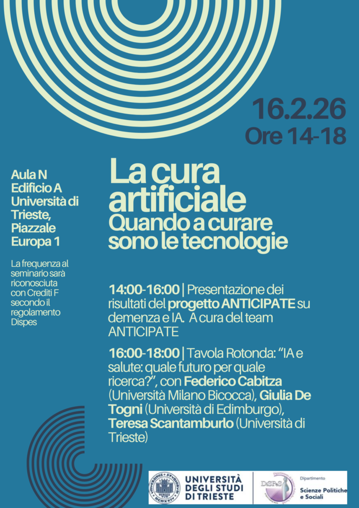 Si segnala l’evento: “La cura artificiale. Quando a curare sono le tecnologie” che si terrà lunedì 16 Febbraio, presso l’Università di Trieste, Piazzale Europa 1 (Aula N, Edificio A).
